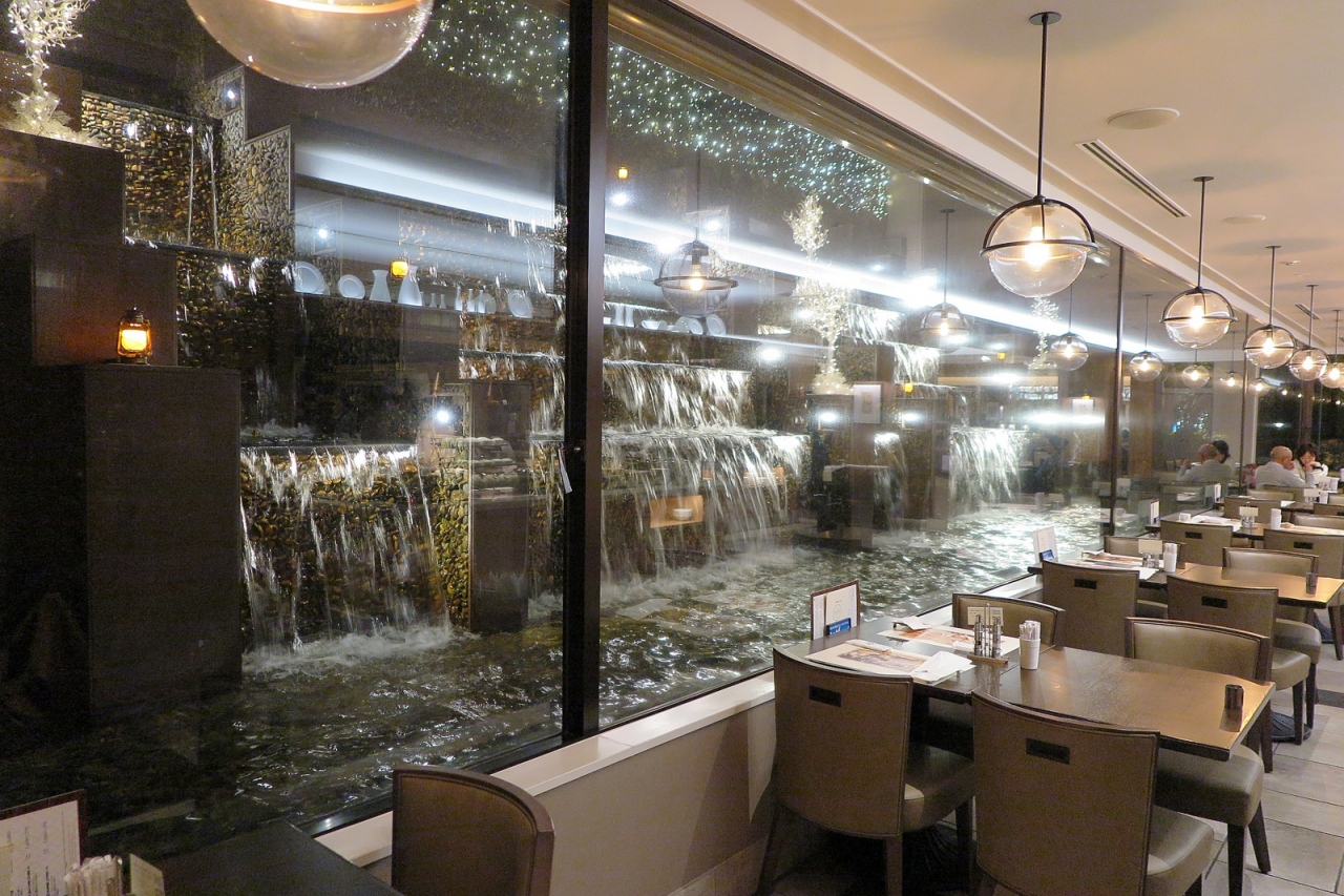 - 朝食会場にもなるブッフェレストランですが、フランスのビストロのような外観、窓の外には水が流れるなど、悪くないです