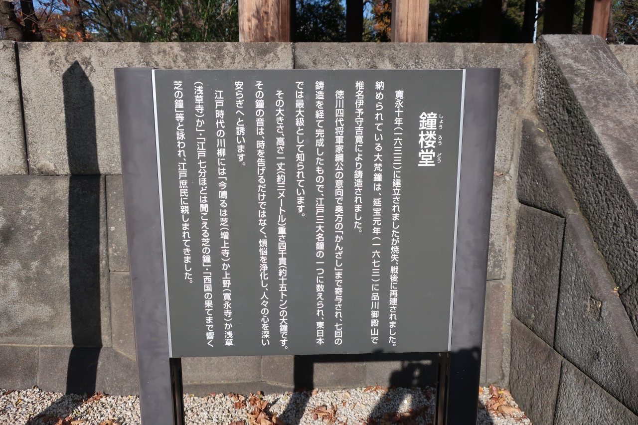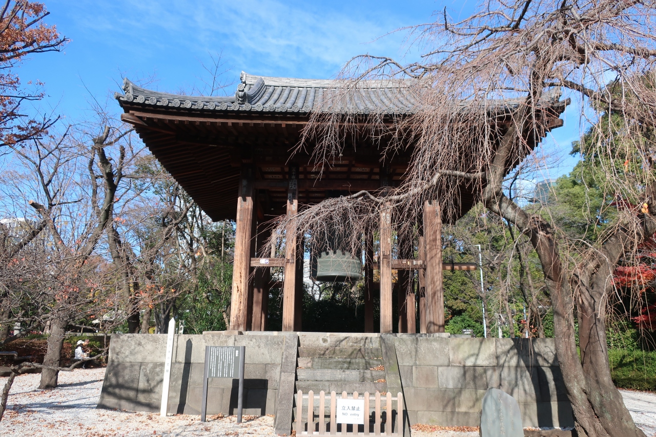 増上寺の境内にありました。三解脱門をくぐると右側にあります。寛永十年の建立されましたが、その後焼失し戦後再建されました。納められている大梵鐘は延宝元年に完成したようです。また、江戸三大名鐘の一つとされています。東日本では最大級のようです。春だと鐘楼堂と枝垂れ桜が重なり合って、素晴らしい眺めになるんだろうなぁ~っと感じました。残念ながら、私が訪れたのは12月なので、枝と鐘楼堂の組み合わせでしたが(笑)。春に、もう一度訪れたいです。