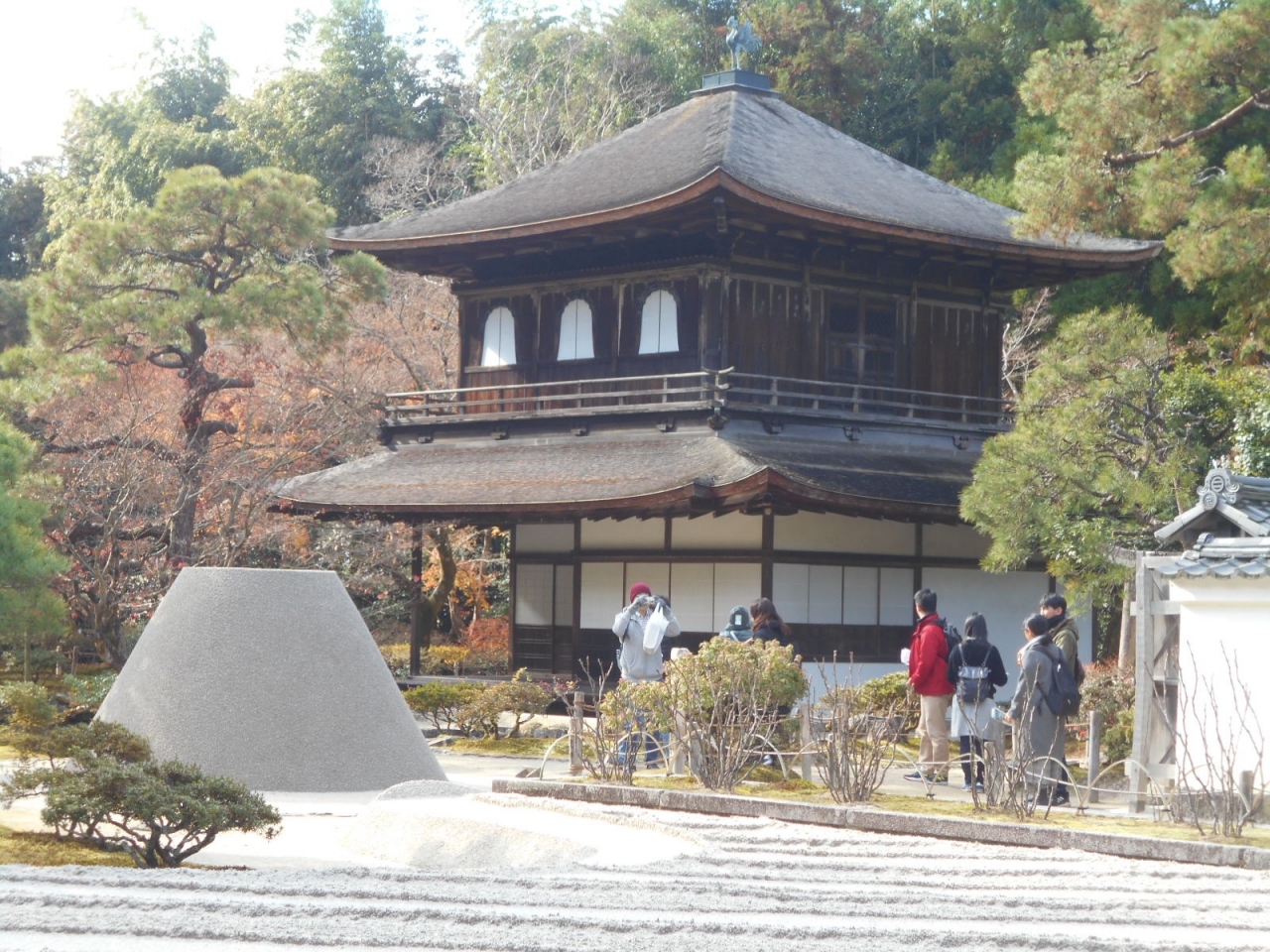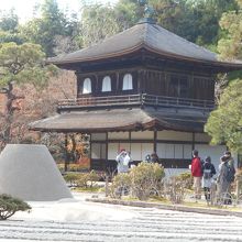 銀閣寺は、銀色ではありません。銀のかわりに黒漆が塗られています。宝形造、柿葺きの楼閣です。初層は書院風、上層は唐様仏殿風です。観音菩薩が安置されています。内部へは入れません。渋く落ち着いた印象です。池越しにみる庭園からの眺め、砂盛から見る眺めなど、それぞれ雰囲気があります。