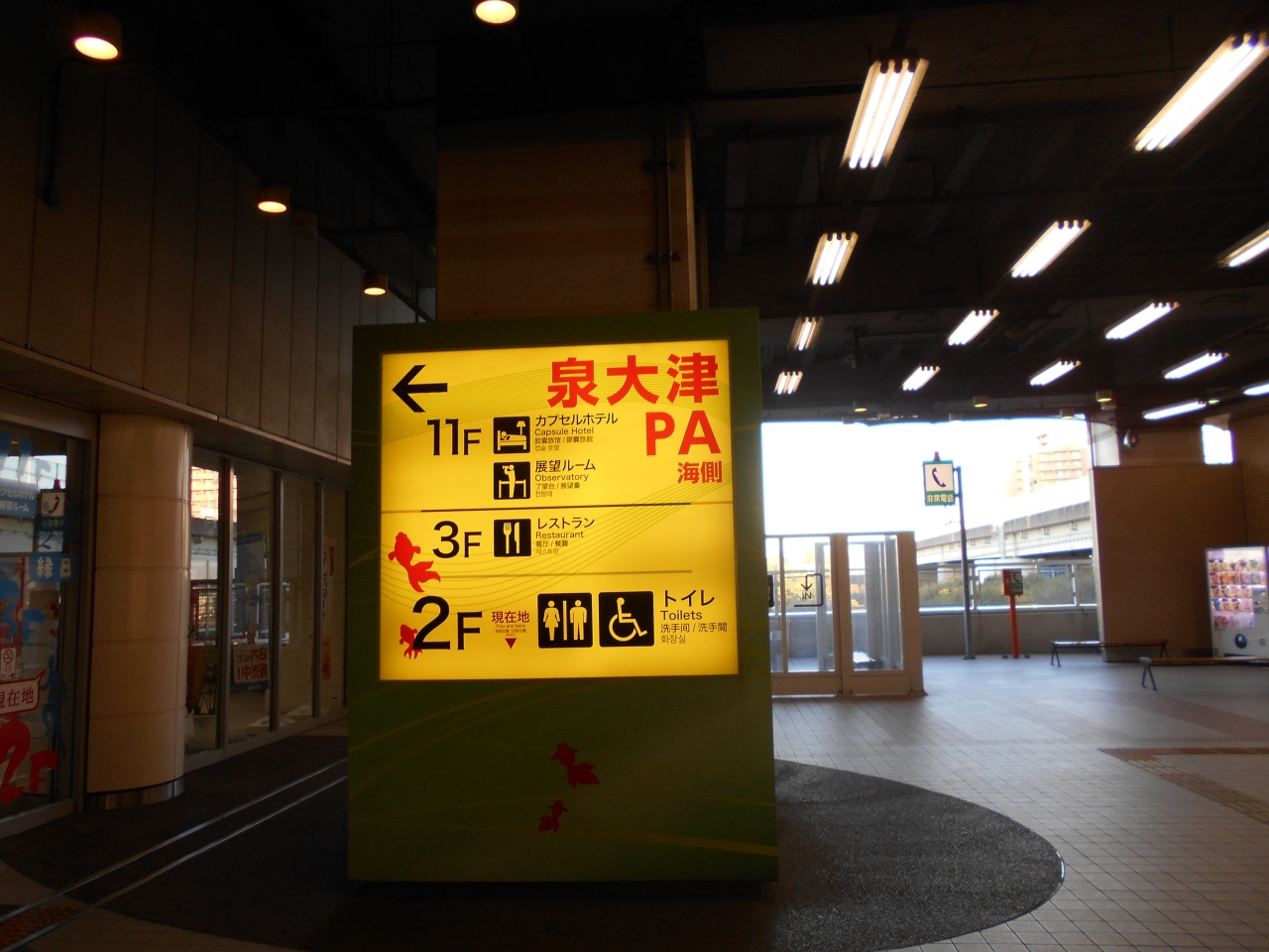 化石探しを終えて帰る途中で少し小腹がすいた。ちょっと何かを食べようかと立ち寄った。本線から下へ降りて薄暗いところが駐車場になる。大型車は上の階に停めるようになっている。大阪人の習性と思うが、普通車も数台とまっていた。広い、きれい、眺めよい場所です。食べ物は悪くはないけれどもそれほど期待しないほうがいいです。カプセルホテルがあるのが驚きである。関空の利用者のことを考えているのだろう。