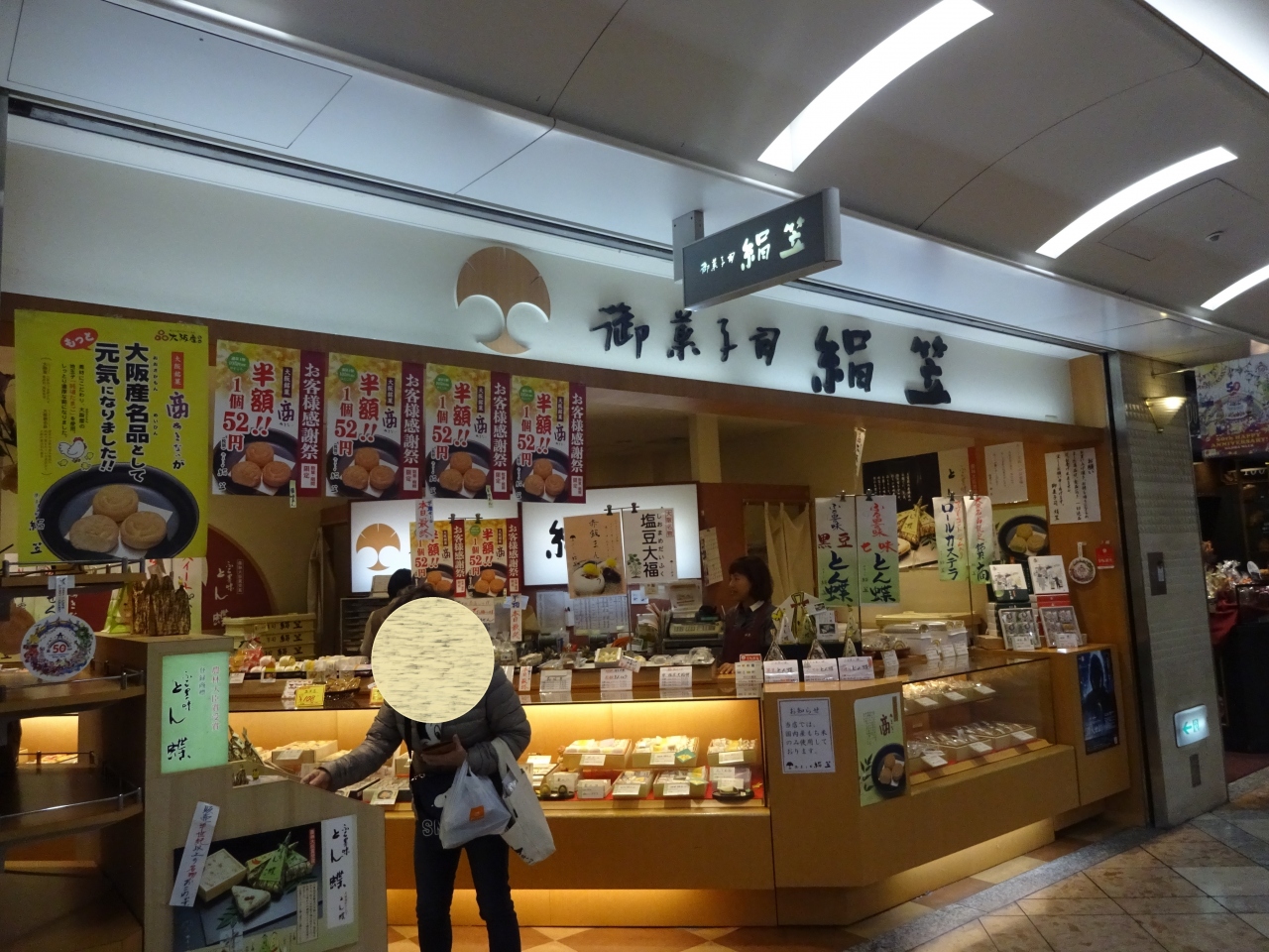 四天王寺からの帰り千日前の通りを歩いていたらこの店の前で和菓子が半額!!と書かれていて、呼び込みもしていました。