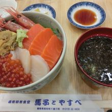 店頭のいけすではイカが泳いでいました。それにつられて、数ある店の中から入店しまして海鮮丼を注文。新鮮さは言うまでもありません。海老が甘くておいしいのに感動しました。