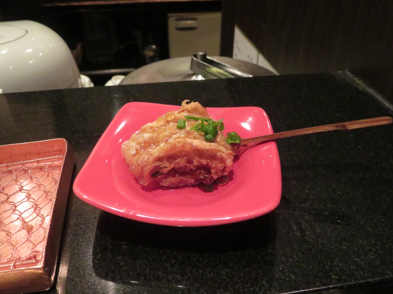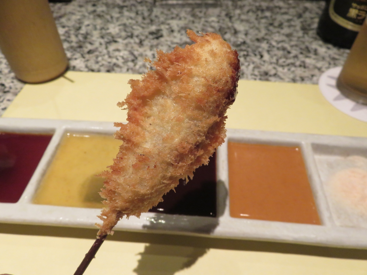 おまかせでオーダー。テーブルにはソースや塩などがセットされ、揚がったものを何をつけて食べるのがオススメか教えてくれます。揚げたてなのでアツアツでやけど注意。ワイワイした感じではなく、ゆっくり落ち着いて食べる感じのお店でした。