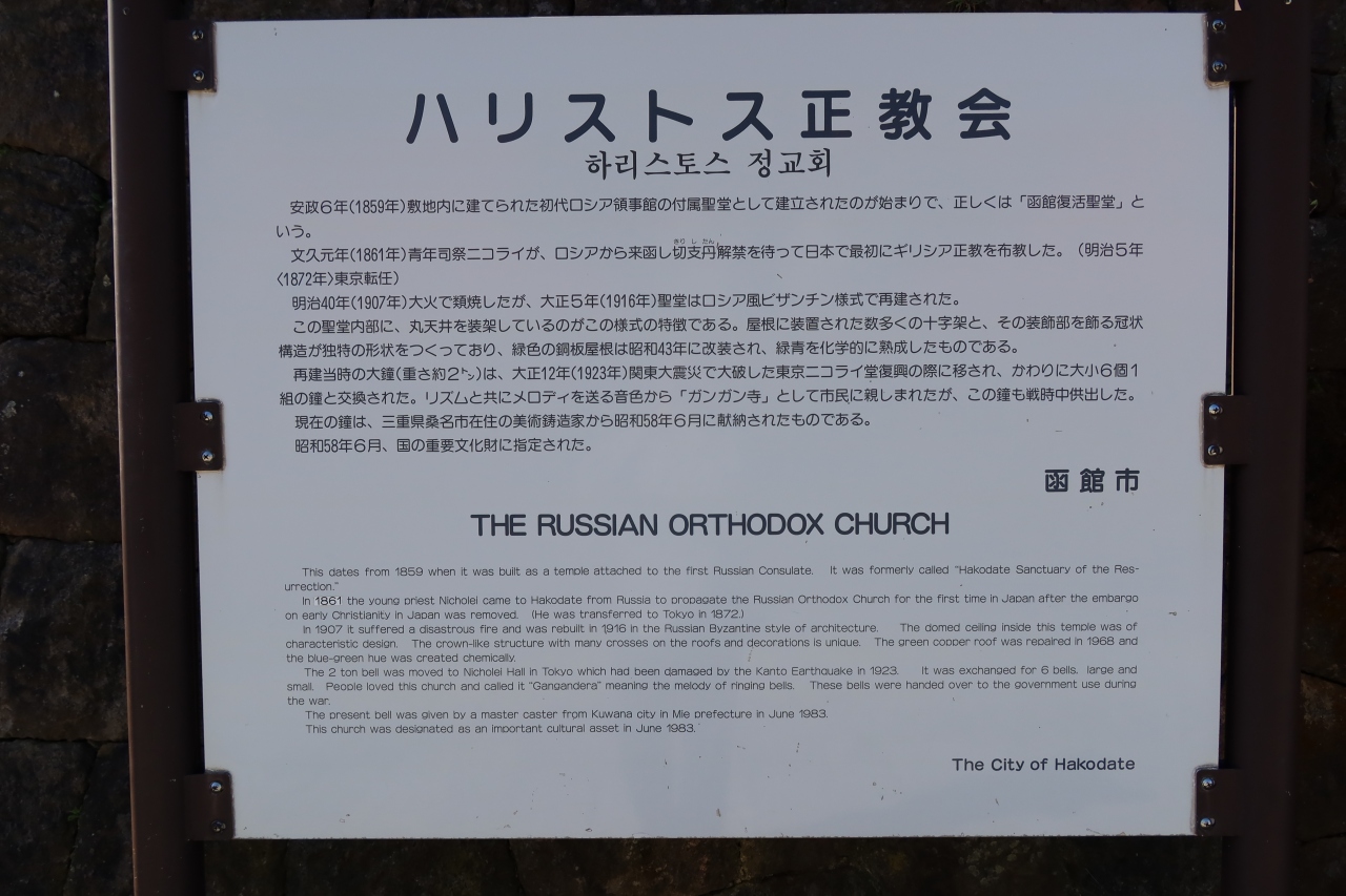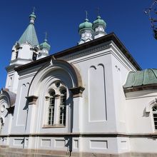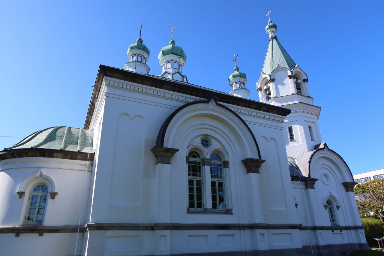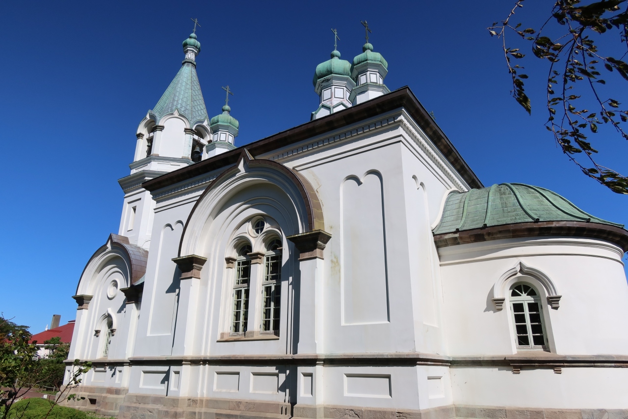 函館の大三坂を上り右手に行った所にある緑の屋根に白亜の壁の美しい教会が函館ハリストス正教会です。函館の観光ガイドやパンフレットの表紙写真になるほどの名所で澄み切った青空をバックにした教会はまるで海外にいる様な光景です。