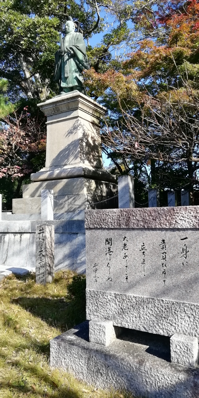 彦根城と玄宮園を見学後、お城の出口に向かって歩いていくと公園内に井伊直弼大老像がありました。銅像は明治時代、直弼の遺徳を顕彰しようとする旧彦根藩士らによって建立されました。最後の官職だった正四位上左近衛中将の正装です。安政5年(1858年)4月、幕府の大老となった直弼は同年6月「日米修好通商条約」に調印して開国を断行したものの大老の信条を組むことのできなかった水戸浪士達に万延元年(1860年)3月3日桜田門外で暗殺されました。ときに46歳でした。像の横に歌碑がありました。