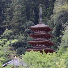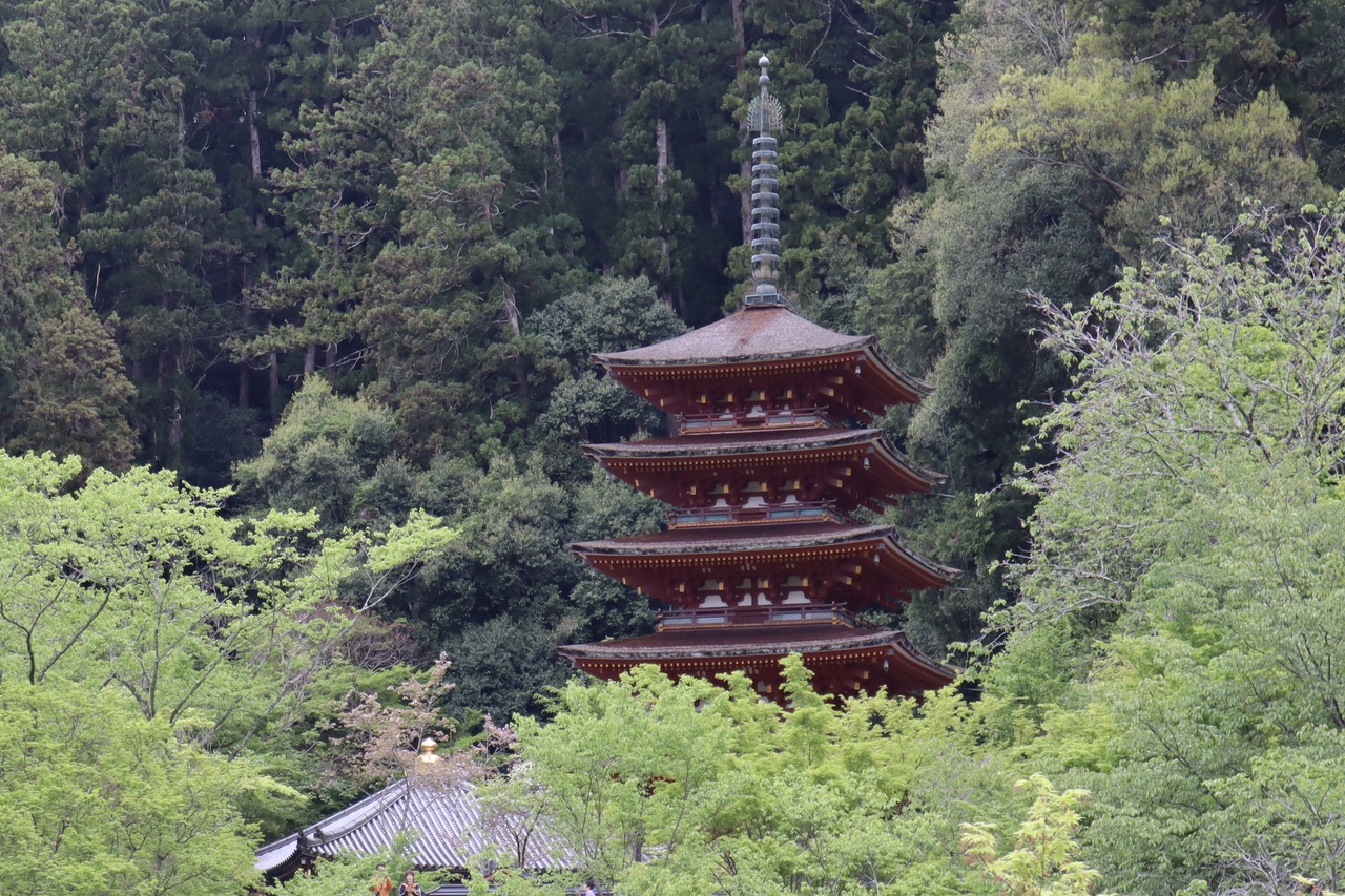 本堂の奥の道を進んでいくと、たどり着きます。本堂までしか訪れない人も多いようで、こちらの方は空いていました。本堂の舞台から見ると、だいぶ遠い山の中にあるように感じたのですが、すぐ近くです。鮮やかな朱塗りの塔が、緑の中に建っているのがとてもキレイです。