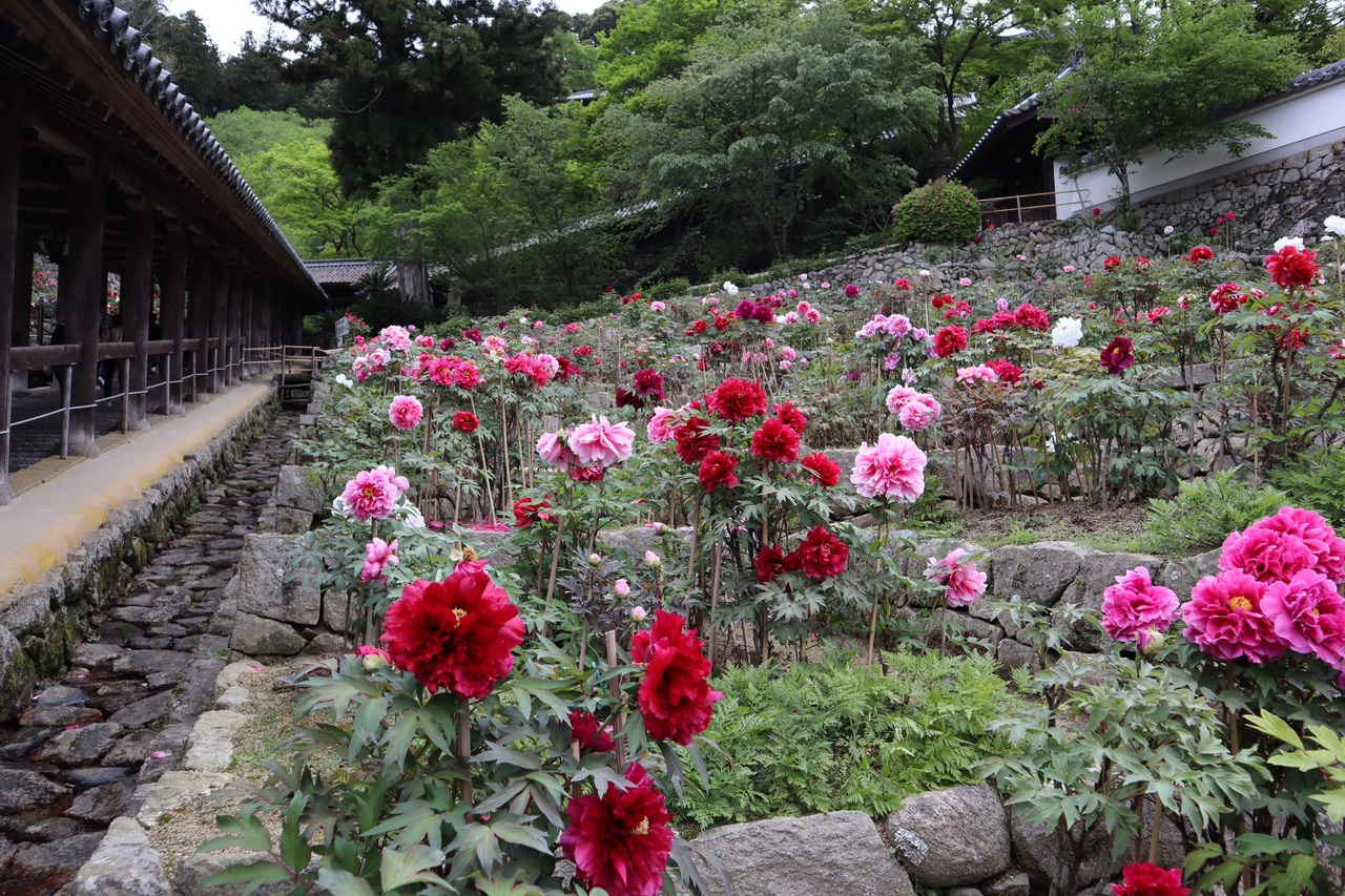色とりどりの大輪の牡丹が咲いていました。GW中でしたがちょうど見頃だったのではないかと思います。本堂に続く登廊の両脇に牡丹が咲いていて、楽しみながら階段を上りました。残念ながら曇っていましたが、晴れていたら青空に映える牡丹が素晴らしかったと思います。