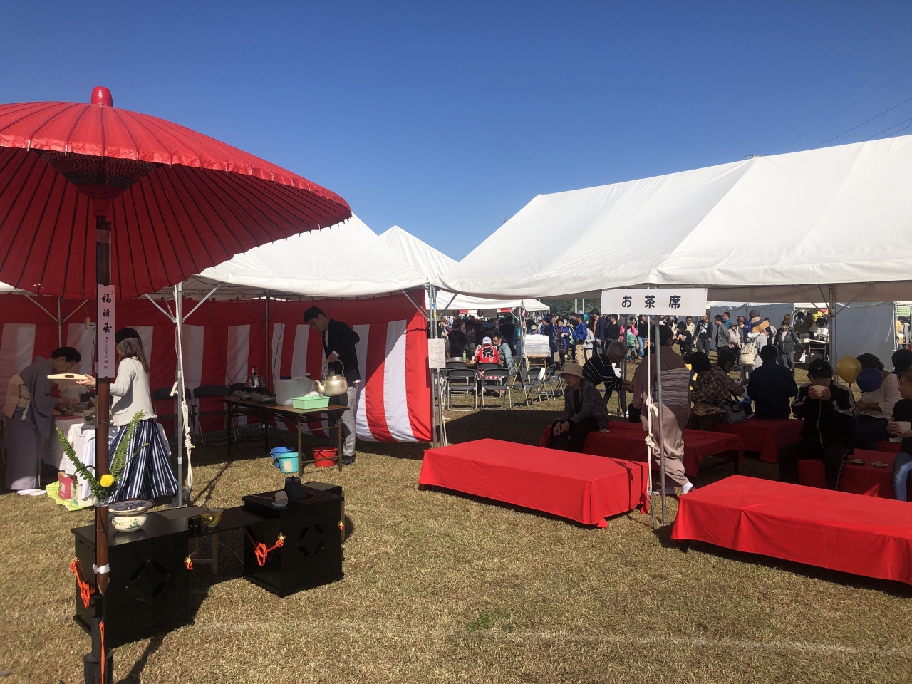 小春日和の今日は堺市北区民まつりです。私の通うお茶の教室からも茶席を出店しました。開店と同時に次々とお客さんが訪れ、休む暇がありません。いいお天気で、地域住民の方々にのんびりくつろいでもらえてよかったです。芝生広場に赤毛氈がひときわ映えました。