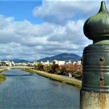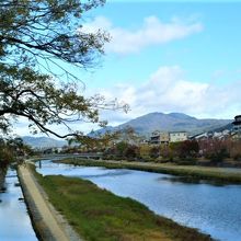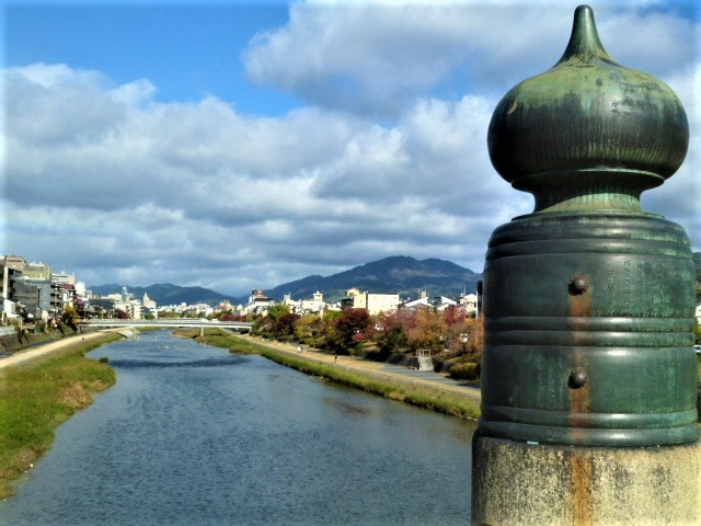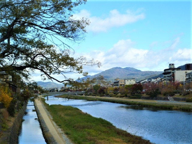 京都の紅葉<東山区;清水寺等>を目的にホテルは河原町通五条に泊まりました;[鴨川]が歩いて3分! いつもは通り過ぎる鴨川がこれほど近くにあったので散策しました…五条大橋の牛若丸と弁慶/応仁の乱で時には合戦の河川敷/幕末志士が行き来する川//、京都の人は良いですね;歴史の一端を語る鴨川がそばなので♪ 上流を眺めれば大きい鴨川と小さい疏水(?)の土手には木々がもう色づいた紅葉が。