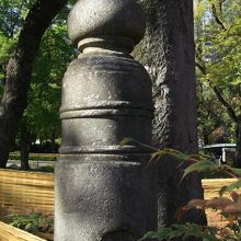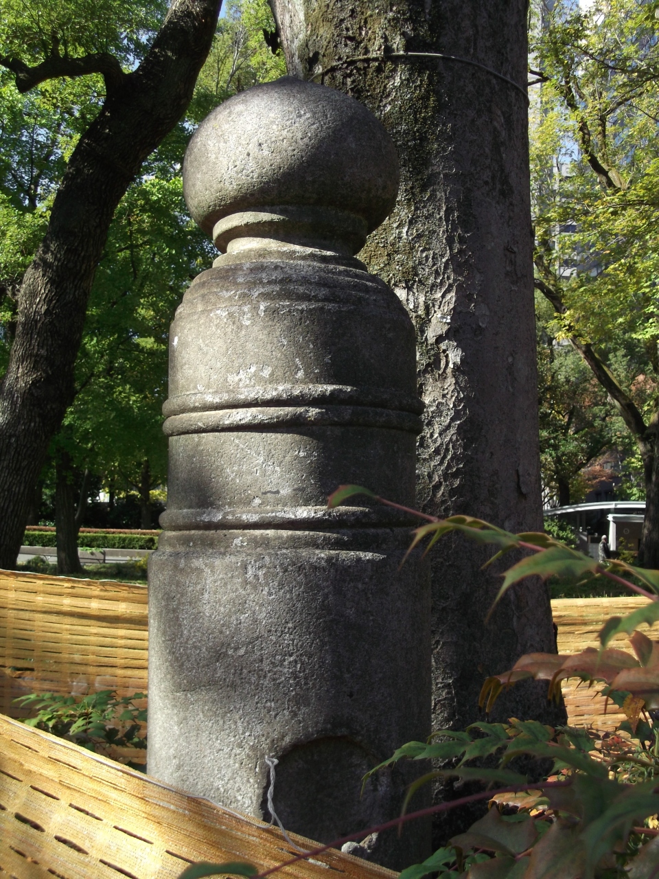 日比谷公園の中央西側、雲形池からほど近いところにこの欄干柱がありました。明治初期に造られた京橋のもので、大正時代の架け替えにあたりここに移築されたものです。どっしりとした重みのある造りは京橋を飾るのにふさわしい感じがします。日比谷公園には色々珍しいものが残されていて、まるで野外博物館のようでもあります。