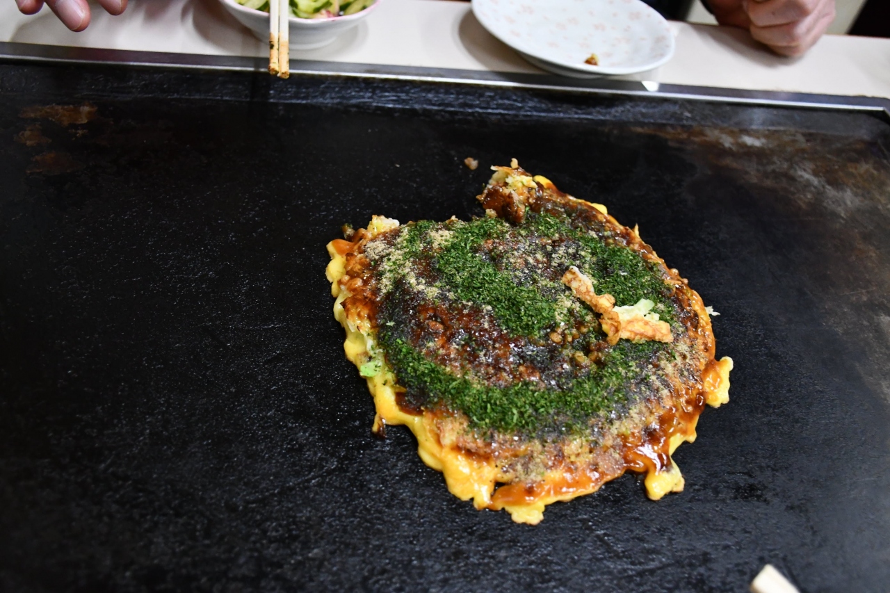 山陽電車別府駅前にあるお好み焼き屋さんです。交番の隣、階段を登って二階です。常連さんが喫煙するので、それを承知でお店に入るという前提のようです。値段はうろ覚えですが、豚玉など普通のお好み焼きが五百円というな具合です。