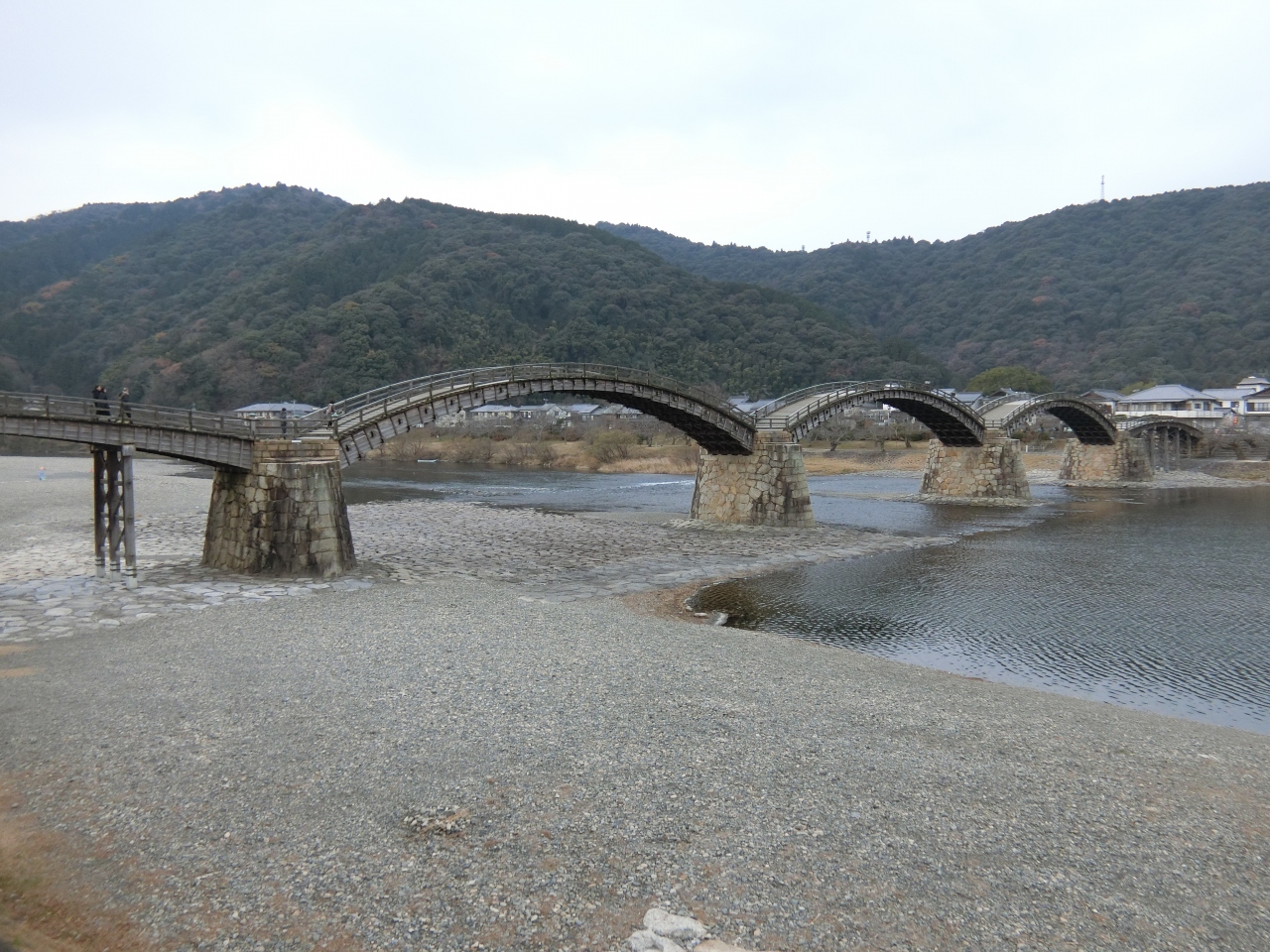 岩国駅から毎時発いちのすけ号のバスがあるので、20分ほどで行かれます。錦帯橋は五連からなるアーチ状の木造橋。とても美しい姿の橋です。河原から橋の下側をみたら、木組みになっていることがわかります。この橋を渡るには入橋料が必要になります。岩国城とセットで買うとお得です。