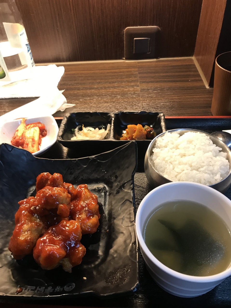 韓国料理が手軽に食べれるチェーン店の韓豚屋さんです。ランチは1000以内でリーズナブルに食べれます。ヤンニョンチキンランチです。あまからいソースが韓国ならではの味付けです。パンチャンはキムチにもやしナムルです。