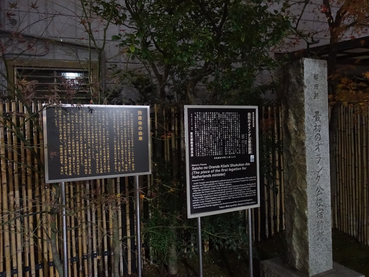 港区芝の商店街から少し奥に入った場所に「西応寺」というお寺があり、その山門前に「最初のオランダ公使宿館跡」を印す案内板と、背丈よりも高い石柱がありました。「こんなところに」というのが正直な感想で、案内書きを読んでもあまりピンときませんでした。