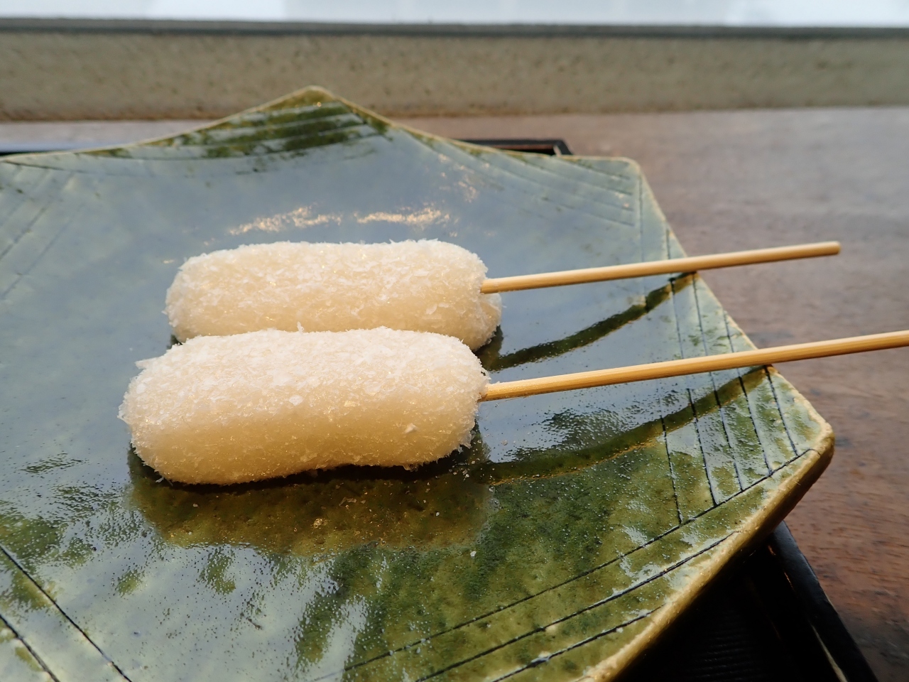 白味噌を甘く炊いたものを求肥で包み氷餅をまぶし竹串にさしまして1包み三本入り、