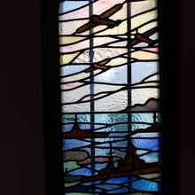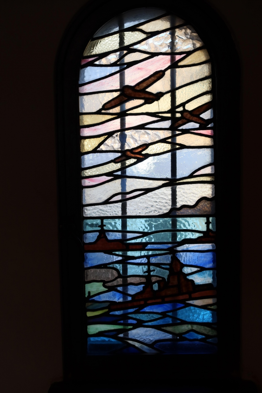 眼を引いたのは時代を感じさせるステンドグラス。戦闘機、軍艦が描かれており時代を感じます。
