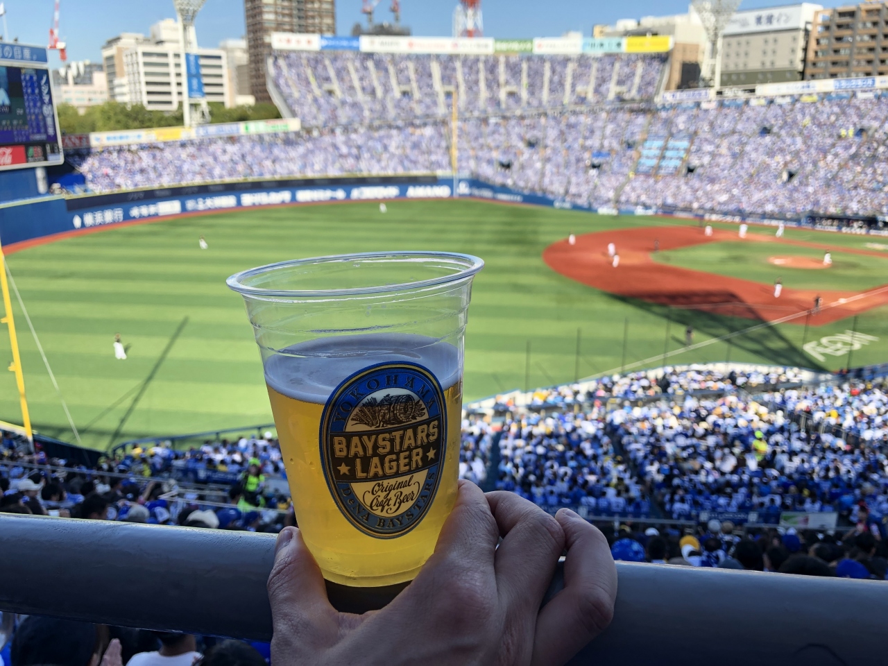 客席はたまたま日影の側でしたが、カンカン照りの日だったので、反対側スタンドだったらかなりキツかったと思います。こちらは気持ちよく風に吹かれながら、ベイスタビールを楽しみました。