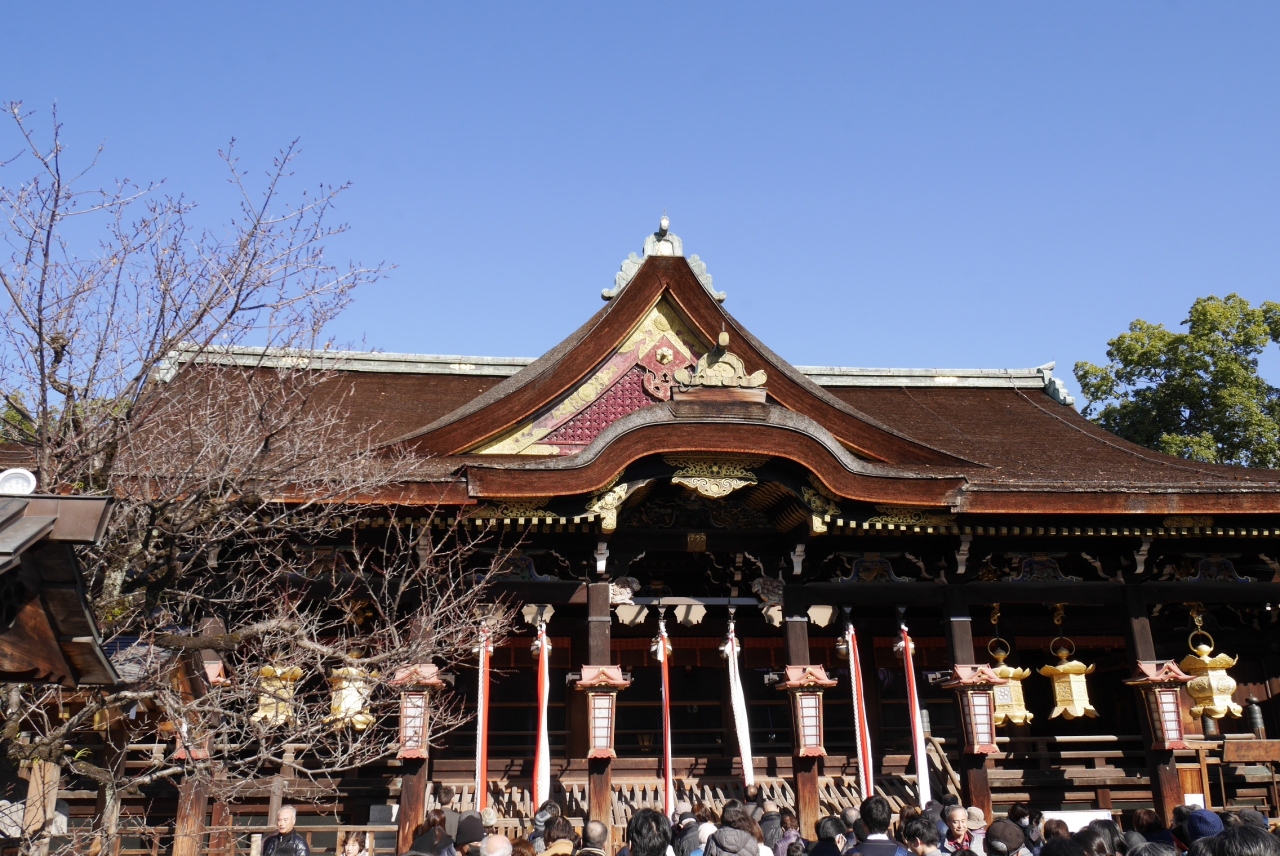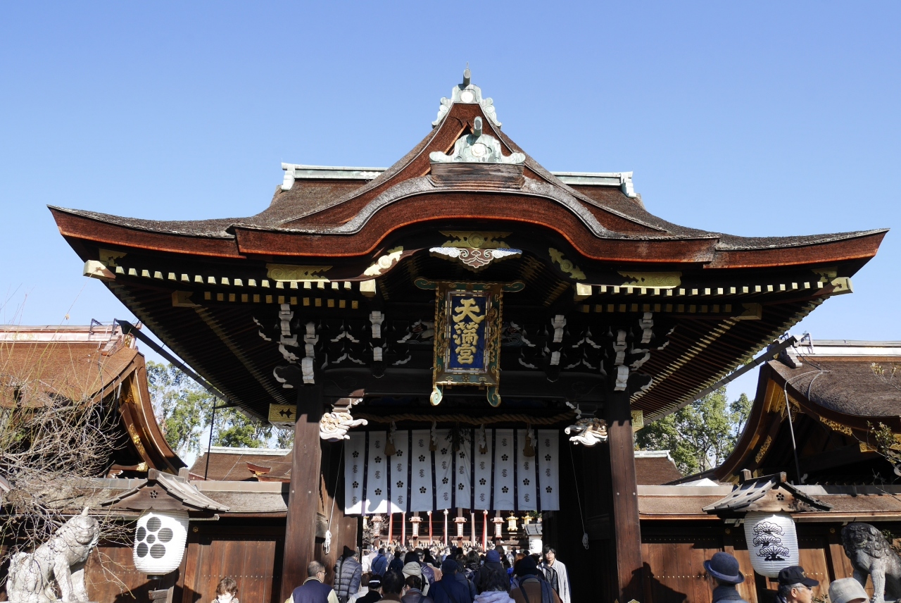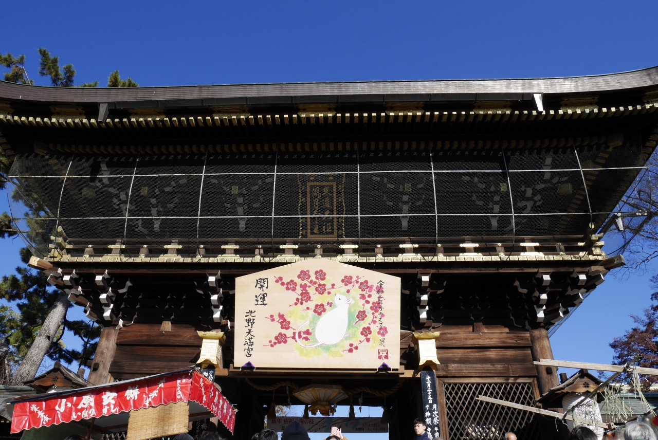 12月末に訪れました。ちょうど終い天神の日で、第一鳥居の前にも店が出ていて、いつもの縁日以上に多くの人が訪れていました。参道の両側にも多くの店が出ていて、臥牛も目立たなくなっています。楼門には2020年の干支ねずみの大きな絵馬が掲げられています。極彩色の三光門を入ると、国宝の本殿には多くの参拝者が列をなしていました。この日まで売っている正月向けの大福梅を購入しました。
