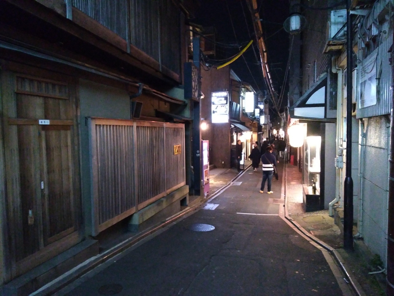 京都の昔からの風情が感じられる狭い道の両側にたくさんの飲食店