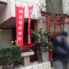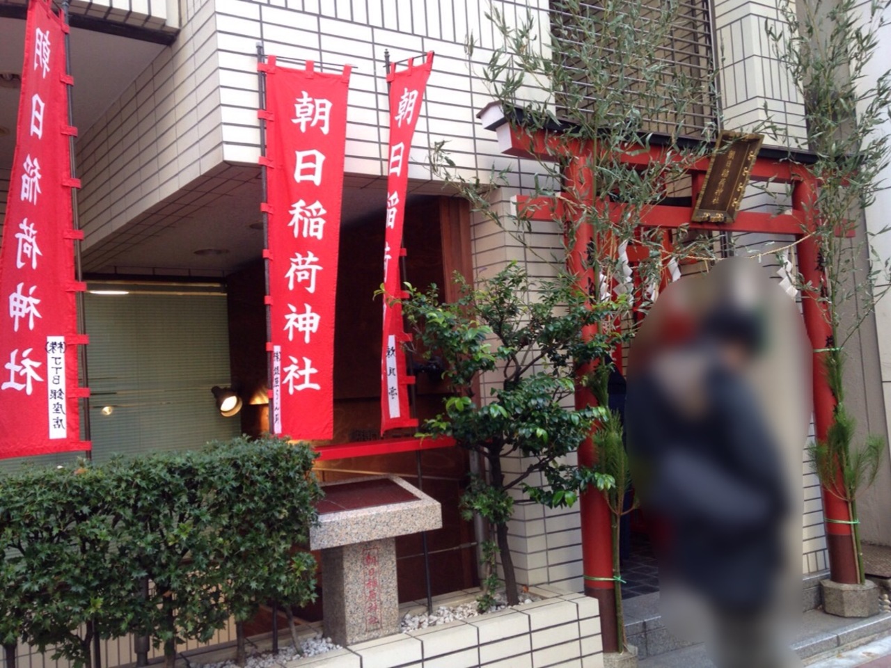 松屋通りと三原通りの角辺りに赤い幟と鳥居がありました。ビルの1階に埋め込むようにあるこちらは拝殿でその先の本殿はビルの屋上にあるという非常に珍しい構造です。熱心にお参りする人が並んでいてちょっとびっくりしましたがどうやらアニメ映画の聖地だそうです。