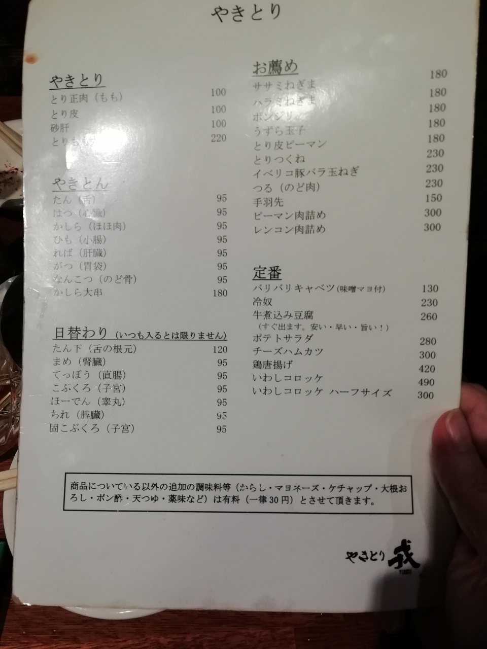JR西荻窪駅北口から徒歩30秒にある「やきとり戒」です。昭和の時代には、あちらこちらあった丸椅子とテーブルのシンプルな飲み屋です。付だしも無いので!とにかく安いです。やきとんは95円から!鳥ももは100円から。なんとハイボールは190円、オススメです、是非。