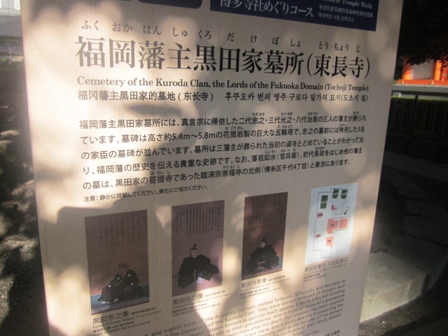 東長寺には、丁度仏殿を挟んで福岡大仏とは反対側、五重塔のある横の暗がりに、こちらの場所も設置されています。歴代藩主のうち、真言宗に帰依したとされる第二代・第三代・第八代の藩主が祀られているそうで、朝の訪問でしたが、お寺の方が付近を掃き清められている姿がとても美しく感じました。コの字型に並んでいますが、どれがどの藩主なのかが若干判り辛いので、図説入りの解説板などがあると尚良いかな、と思いました。