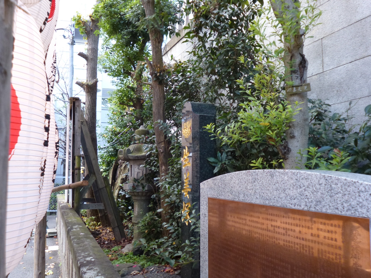 年末に芝大神宮にお参りしました。「生姜塚」は、正月用に飾られた提灯の陰に隠れており、脇からかろうじて見ることが出来る状態でした。漆黒の石に金色の文字が刻まれており、普段はとても目立ちますが、この日は参拝客の目には触れにくい場所でした。かつて、この近辺には生姜畑があったとのこと、現在では想像もつきません。