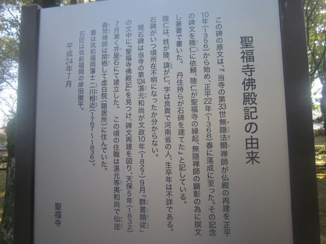 聖福寺の中では、山門と並んで一番の見所と言えるのがこちらの仏殿で、ご本尊もこちらにいらっしゃいます。大雄宝殿を掲げた扁額は、中国や韓国でよく見かける寺院のテイストを感じ、やはり向こうからの影響を強く感じる博多らしいお寺の仏殿の一つだと一見して判りましたが、ここにはもう一つ見所があって、それは仏殿向かって右手にひっそりと建つ石碑です。解説は画像を確認していただきたく思いますが、この寺の歴史が色々と感じられて、とても良かったです。