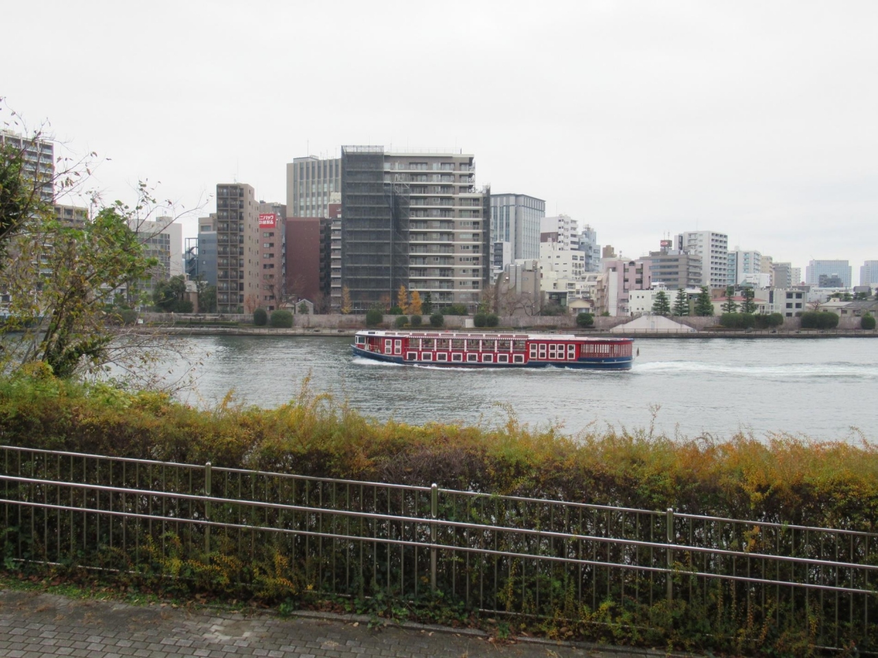 途中では左手 (北方向) に永代橋が、右手 (南方向) に中央大橋が、正面 (東方向) にビル群や隅田川とともに遊覧船も見え、飽くことなく眺めていられます。