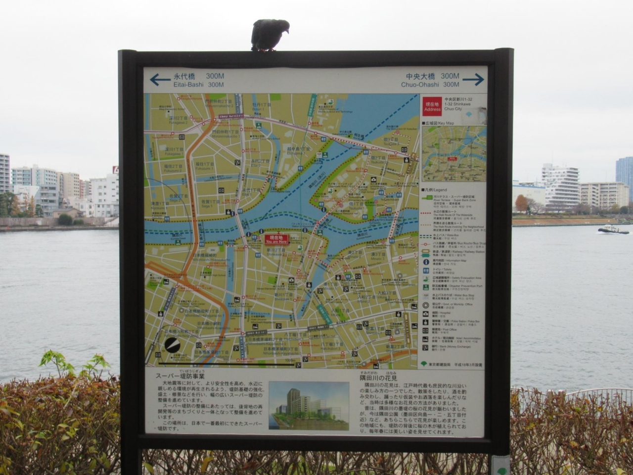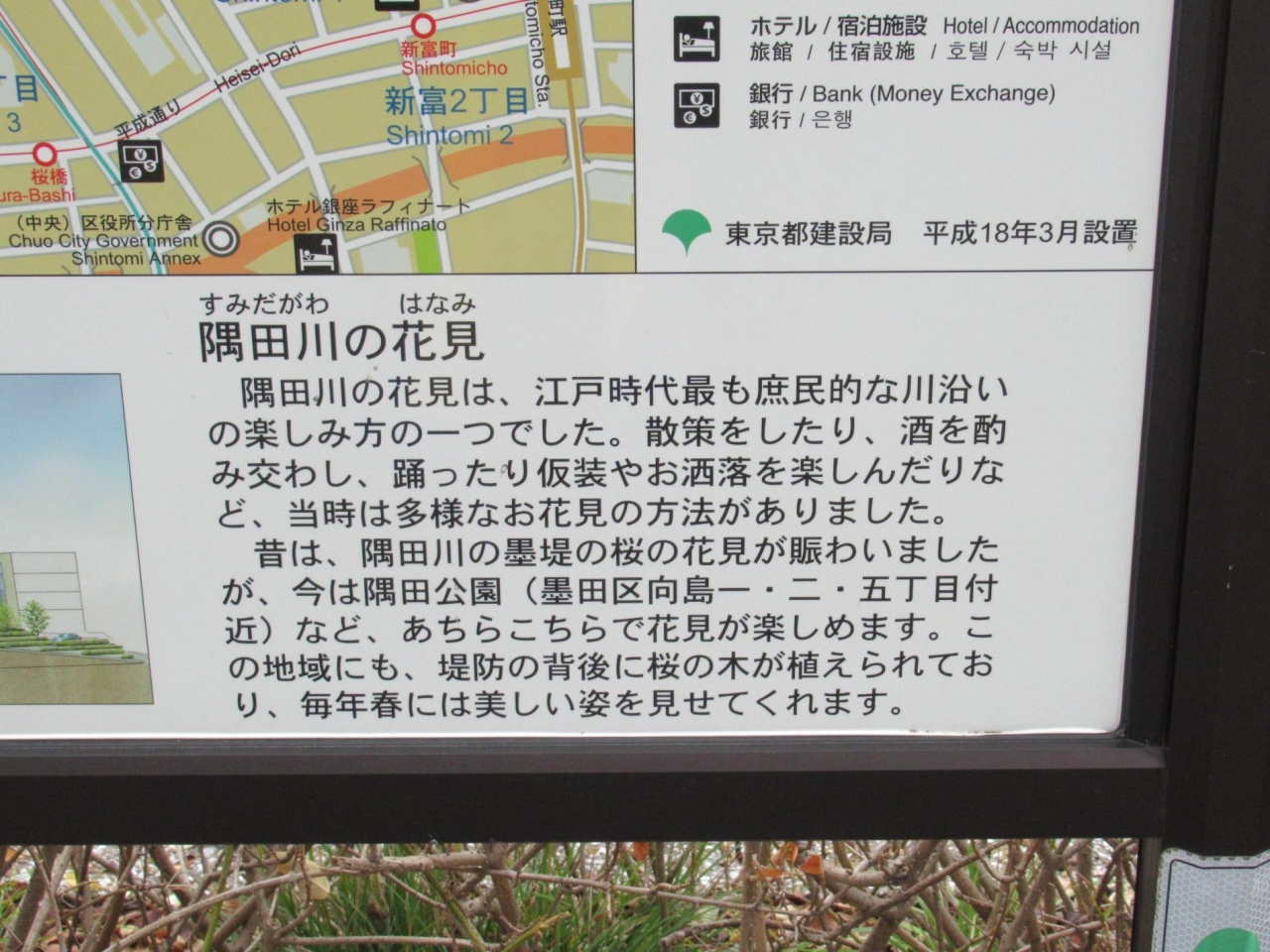 途中に案内地図があるので見ると、水辺の散策ルートや下部に「隅田川の花見」の説明などが載っているのでとても役立ちます。