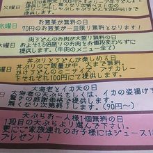 14時までの利用客が対象になるようですが、日により惣菜やサラダ、天ぷらが1品無料で貰える等の特典があるそうです。