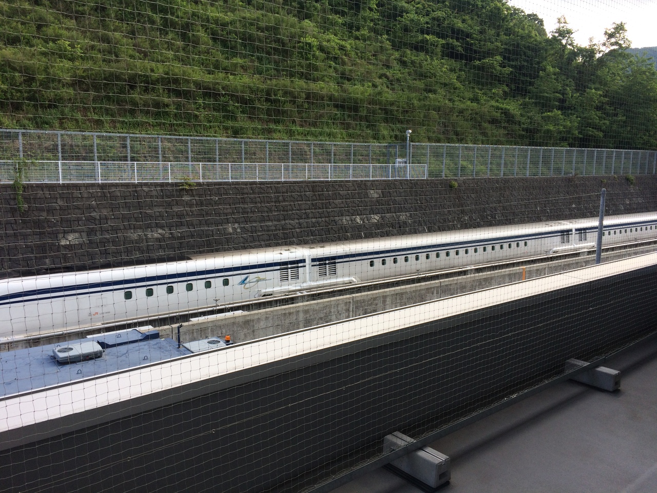 手前の建物は、お土産が買えるショップで3階建てでした。奥の建物は、入場料が必要です。リニアが見学センターの前を通る時には、館内放送があるので、館内の人たちが2階のガラス張りのところや3階に群がります。あっという間です。