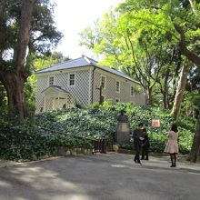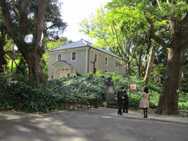 JR山手線田町駅より慶応仲通り商店街を散策し慶應義塾大学三田キャンパス正門から入って左側の丘の上、森に囲まれた中にある慶応義塾三田演説館に歩いて10分ぐらいで着きます。慶応義塾三田演説館は慶應義塾創立者の福沢諭吉等により1875年に建設された日本最初の演説会堂で外観は木造瓦萱、なまこ壁で窓、門構えは洋風の日本独特の手法の建築で見ごたえありますので福沢諭吉先生を偲んで立ち寄ることをお勧めします。直ぐ前に福沢諭吉銅像がありました。