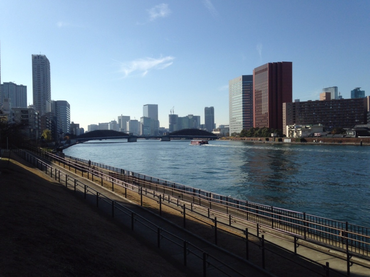 月島のもんじゃストリートを歩き回って疲れたので道を2本ほど挟んで平行して流れる隅田川の川べりに出てみました。2つのアーチが特徴的な勝鬨橋に向かって平べったい観光船が進んで行くのを眺めていると良い気分転換になりました。