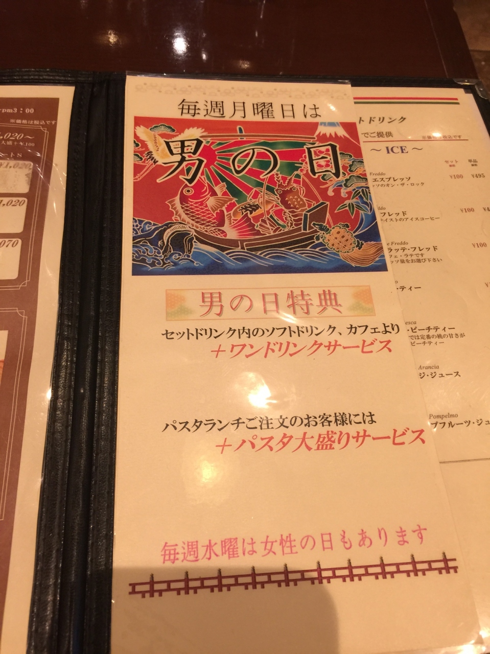 月曜日のランチで利用しました。月曜日は男の日!ワンドリンクサービスとパスタ大盛サービスです。