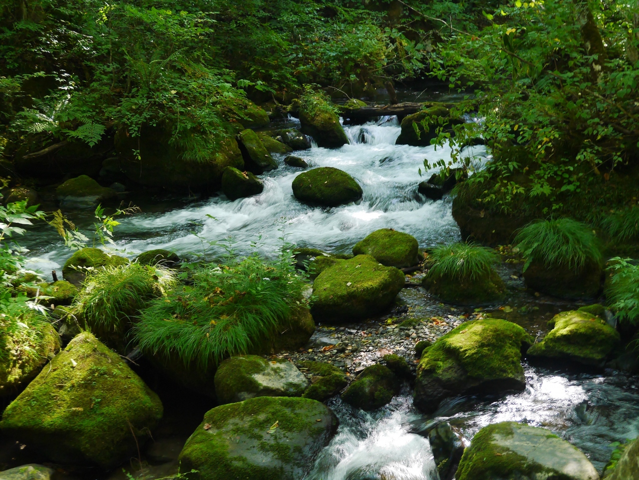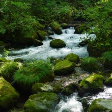 阿修羅の流れの少し上流側でやや流れが緩やかになっているあたりに、苔むした岩が流れの中に点在するところがあり、ここを九十九島と呼ぶそうです。阿修羅の流れとは対照的に川幅も広く、ほぼ水平の穏やかな流れでした。