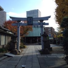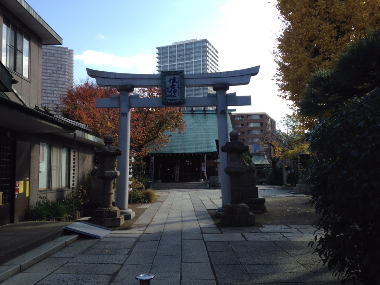 佃川支川の近くにあります。徳川家康が関東下降の際に縁のあった大阪の佃の住吉神社の神主と漁師がこの辺りに移り住んで佃の名前と共に神社が分霊されたとのことで江戸時代の1646年創建です。拝殿は隅田川の方向を向いて建っており隅田川岸にも赤い鳥居がありました。いかにも海上安全のご利益がありそうです。