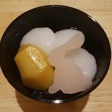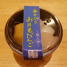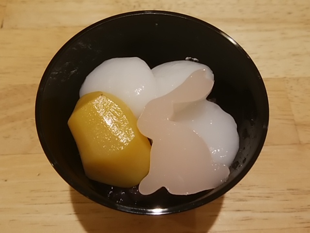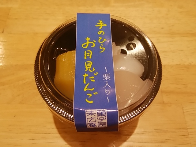 「手のひらお月見団子」320円(税込)です。小さいカップに白玉みたいなお団子が入っていて、栗、うさぎ型のようかん、粒あん入り。お団子は、上に3個、カップの底にも2個入りでした。