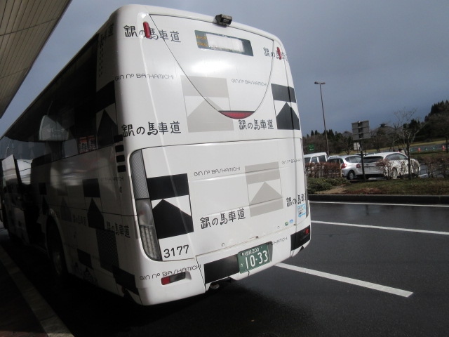 コウノトリ空港に飛行機(JAC)が遅れて到着しましたが、城崎温泉行のバスは待っていてくれました。出てくる乗客を確認してから出発するので、かなりゆっくりと時間たってから出発です。温かい車内でバスの車窓と座席が気持ちよいので、タクシーを使わなくてもよいです(タクシーなら7000円ほど)。バスの車体は銀の馬車道、ラッピングでした。銀というのは生野銀山の銀、ですね。