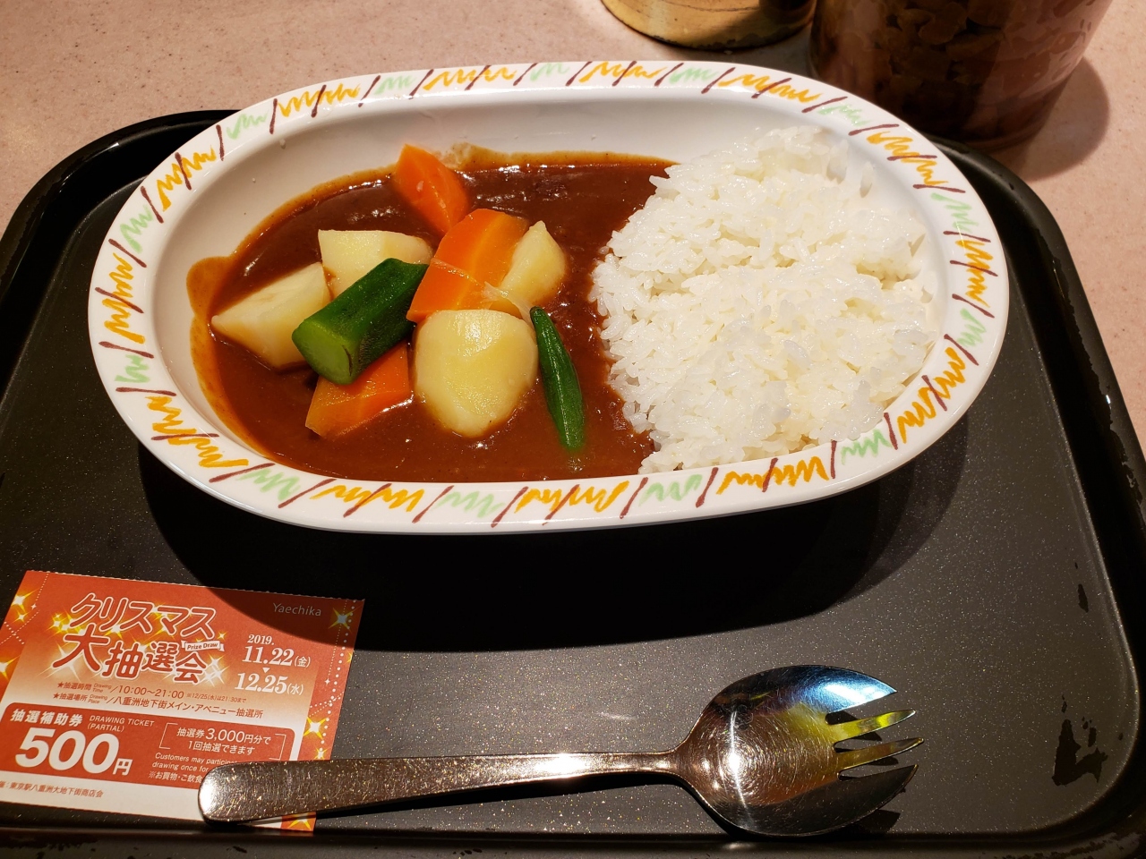 八重洲地下街、大丸のすぐ近くという好ロケーションにあって利便性が高いカレーショップ。セルフサービスながらいろんなバラエティがあって500円~600円程度と安い。ときどき390円とかタイムセールもやっているようだ。