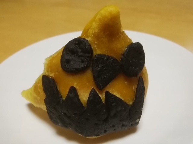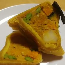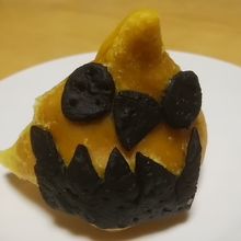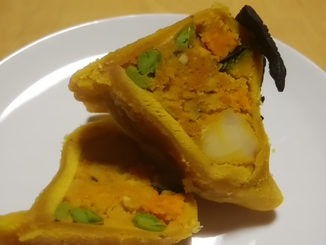 サモサは、黒い薄いナンみたいなのを表面にくっつけて揚げてあるみたい。おばけを象ってると思われる。中にはかぼちゃ、枝豆、じゃがいも?の入ったかぼちゃフィリングがみっちり。