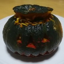 「野菜ビリヤニ」1296円(税込)と「パンプキンサモサ」388円(税込)です。野菜ビリヤニは、小玉のかぼちゃの中をくりぬいて、ついでに目や口のくりぬいて、ジャックオランタンになっています。