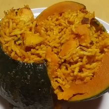 その中に、かぼちゃ、さつまいも、しめじなどが入ったビリヤニが入っています。ぱっと見、そんなに量はなさそうだったけれど、割ってみると、あら、パツンパツンにつまっていました。美味しい。周りのかぼちゃもほっくりと甘くて美味しかったです。