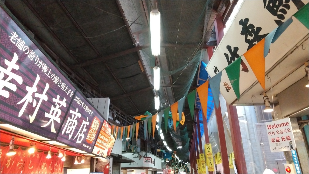 那珂川に架かる柳橋のそばに「柳町市場連合」があります。お菓子屋さん,鮮魚店,食堂等たくさんのお店があり,たくさんの人が行き交う活気あふれる空間です。博多名物の明太子屋さんも複数あって,購入したところとっても美味しかったです。
