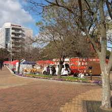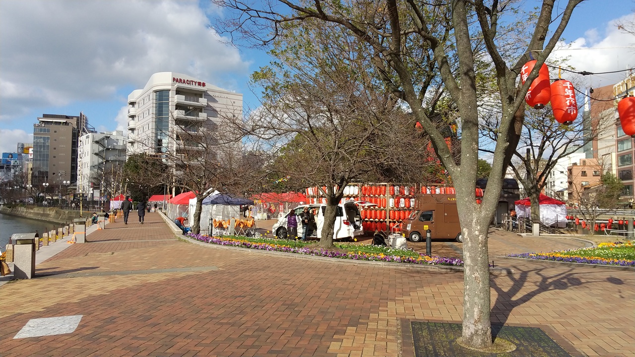 キャナルシティから「清流橋」を渡った場所が「清流公園」です。見晴らしがよく,花や木々が植えられており,散策途中の休憩にぴったりの癒しの空間になっています。年末に訪れたところ,イベントの準備中で,イベントスペースとしても利用されているようでした。