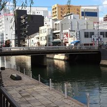博多川に架かるいくつかの橋のうち,川端商店街と中州を結ぶ橋です。川端側は商店街や櫛田神社で有名ですが,中州側の周辺にも,五足の靴文学碑や川端飢甚地蔵尊など歴史ある建造物が残っていて,散策にお勧めの場所です。