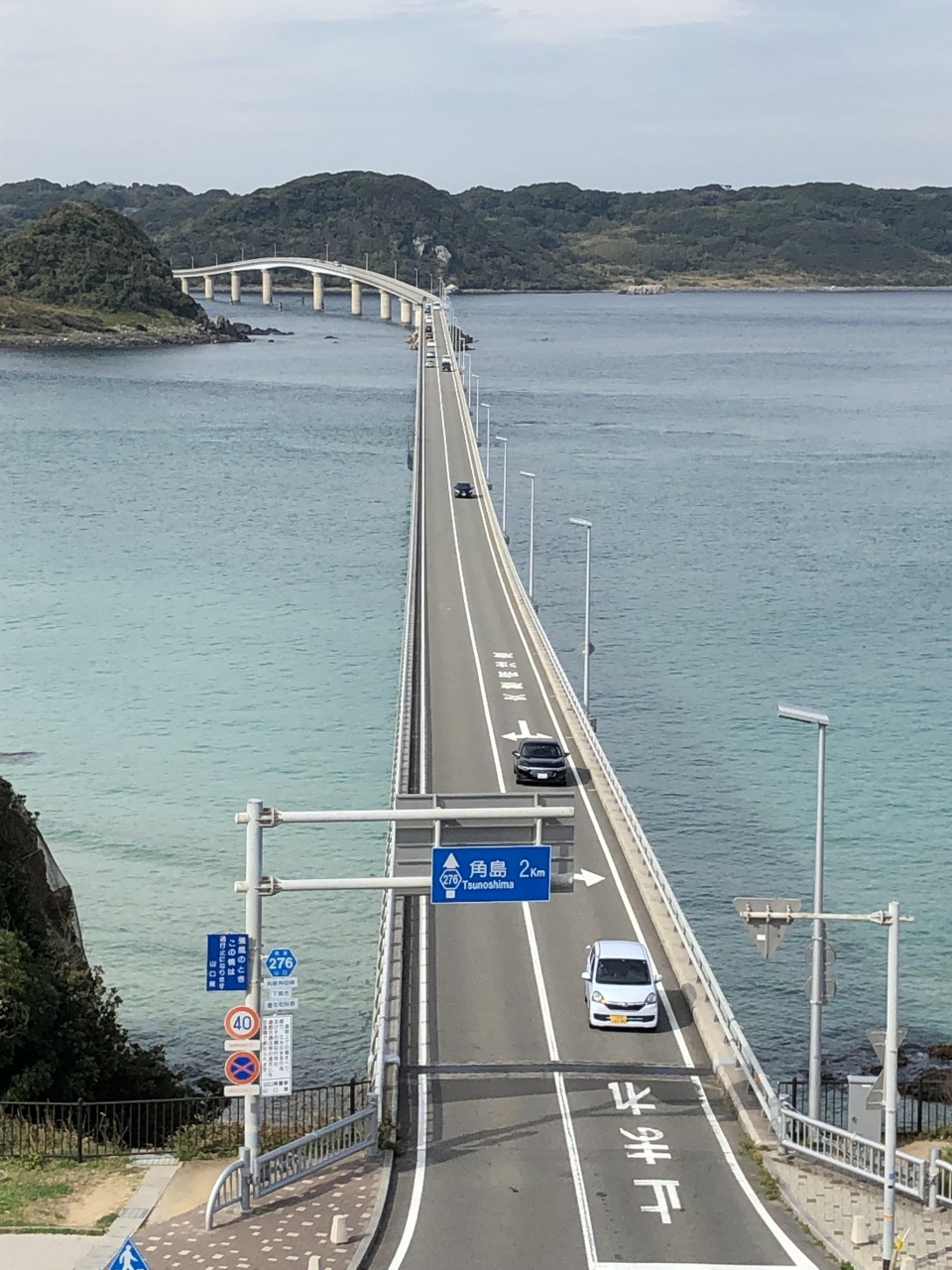 山口県下関にある角島。エメラルドグリーンの海の上に一直線に伸びていく角島大橋。CMで見ていつか行きたいと思っていました。時間が無くて島までは渡っていないですが、展望台からの眺めだけでも十分に来た甲斐がありました。曇り空だったので、快晴の時ならもっと綺麗なんだろうなと思いました。