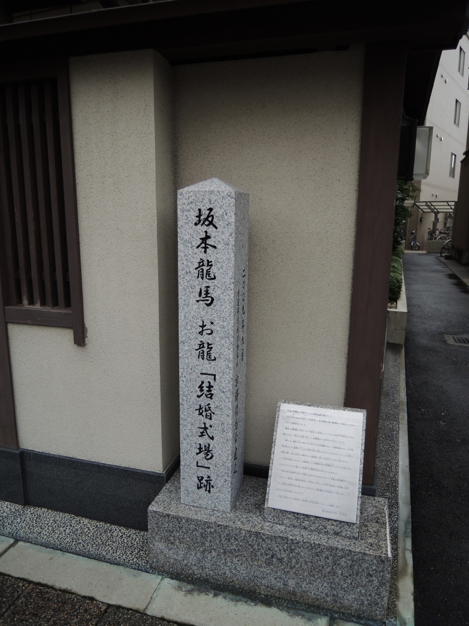 三条通り沿いに散策がてら歩いているとひょっこりと見つけるといった感じで、坂本龍馬とお龍の結婚式場跡の碑を目にできます。当時の建物は残っていませんが、碑の横に説明書きがあり、青蓮院の旧境内で、本堂で内々の結婚式を挙げたことが書かれていました。