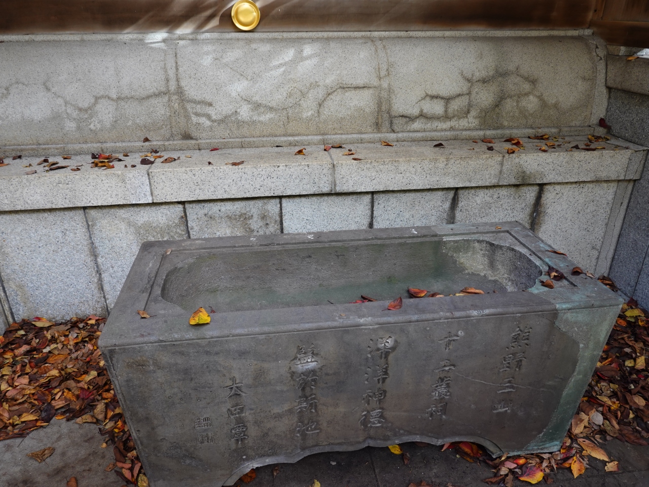 新宿中央公園に隣接した「熊野神社」の境内にはいくつかの文化財がありますが、そのひとつが「大田南畝の水鉢」です。案内板によると、奉納されたのは19世紀の初頭で、蜀山人の別号で知られる狂歌師・太田南畝の書による銘文が刻まれているということです。本殿の脇にあり、周囲を落ち葉に囲まれている様から、今年も残り少ないことが感じられました。