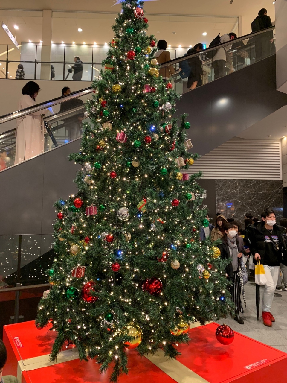 毎年恒例です。地下鉄を降りて地上階を出るとまず出てくるのがこのクリスマスツリーです。大きさはかなり大きいです。オーナメントがたくさんついていてキラキラしています。毎年飾り付けは大きく変わりませんが、ほっと安心します。